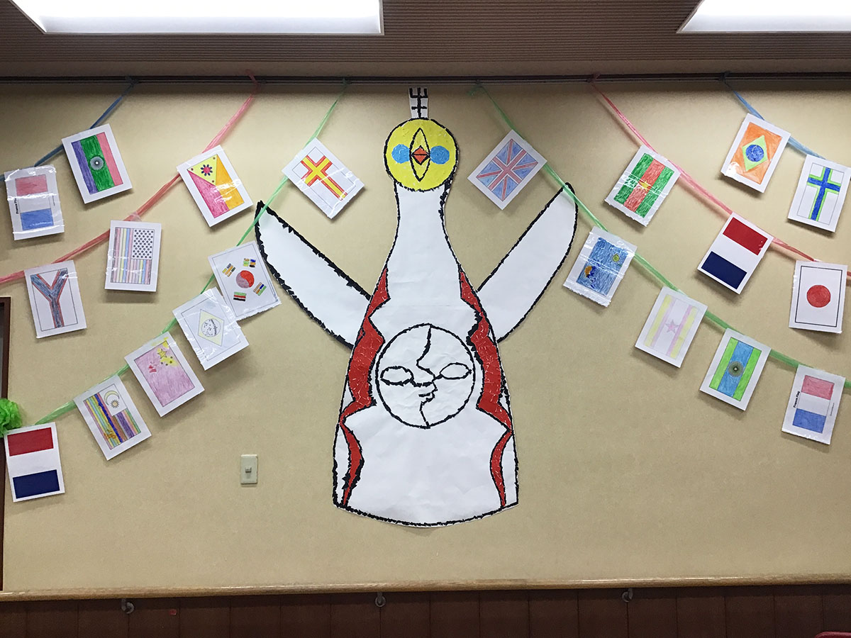 今年のテーマは『万博』でした!テーブルや壁に各国の国旗やいろいろな国の紹介もありました♪
