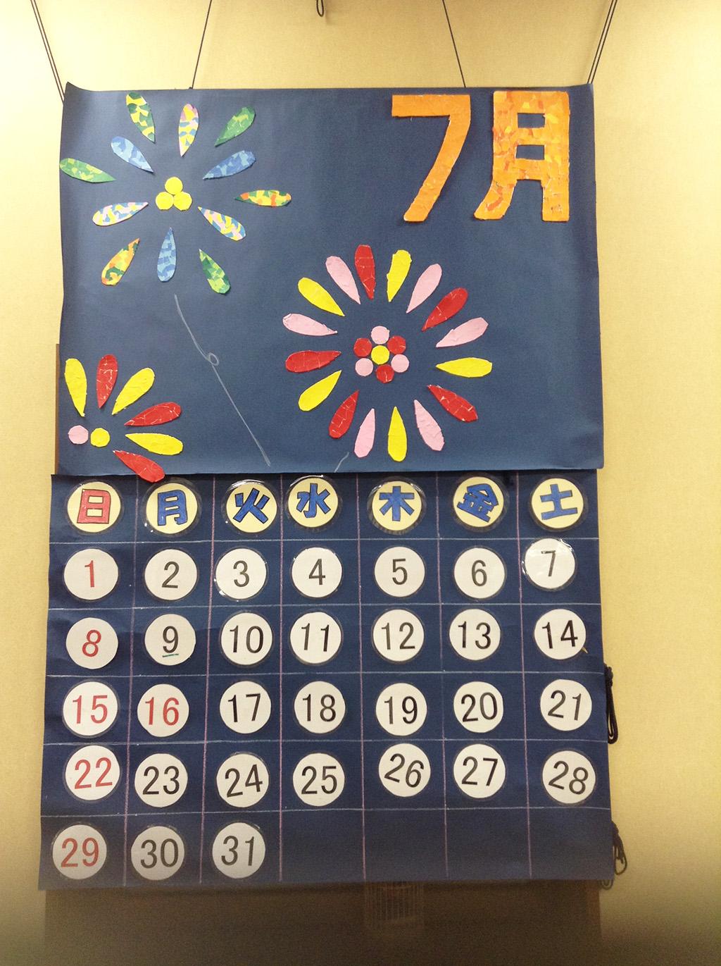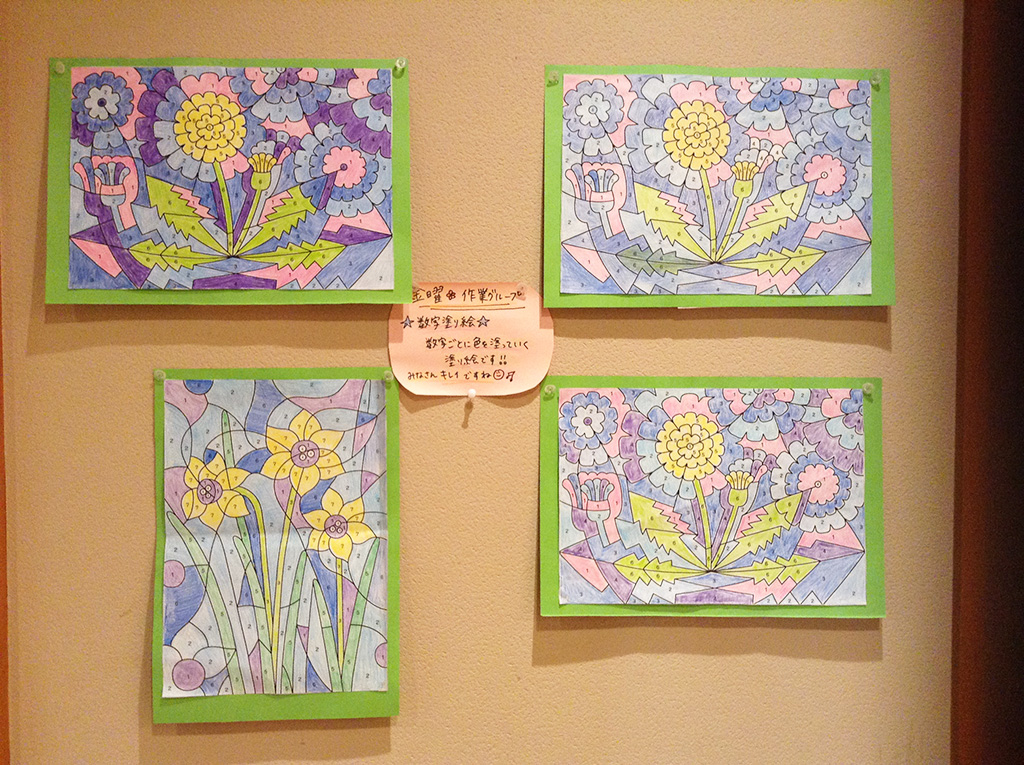平成30年7月:ご利用者様の作品集 皆さんで共同作業!折り紙のちぎりで花火のカレンダー作り♪ ご利用者様が作られた新聞紙を使用した手提げです! 数字塗り絵の作品です!数字ごとに色を変えていくので脳トレにもなります☆
