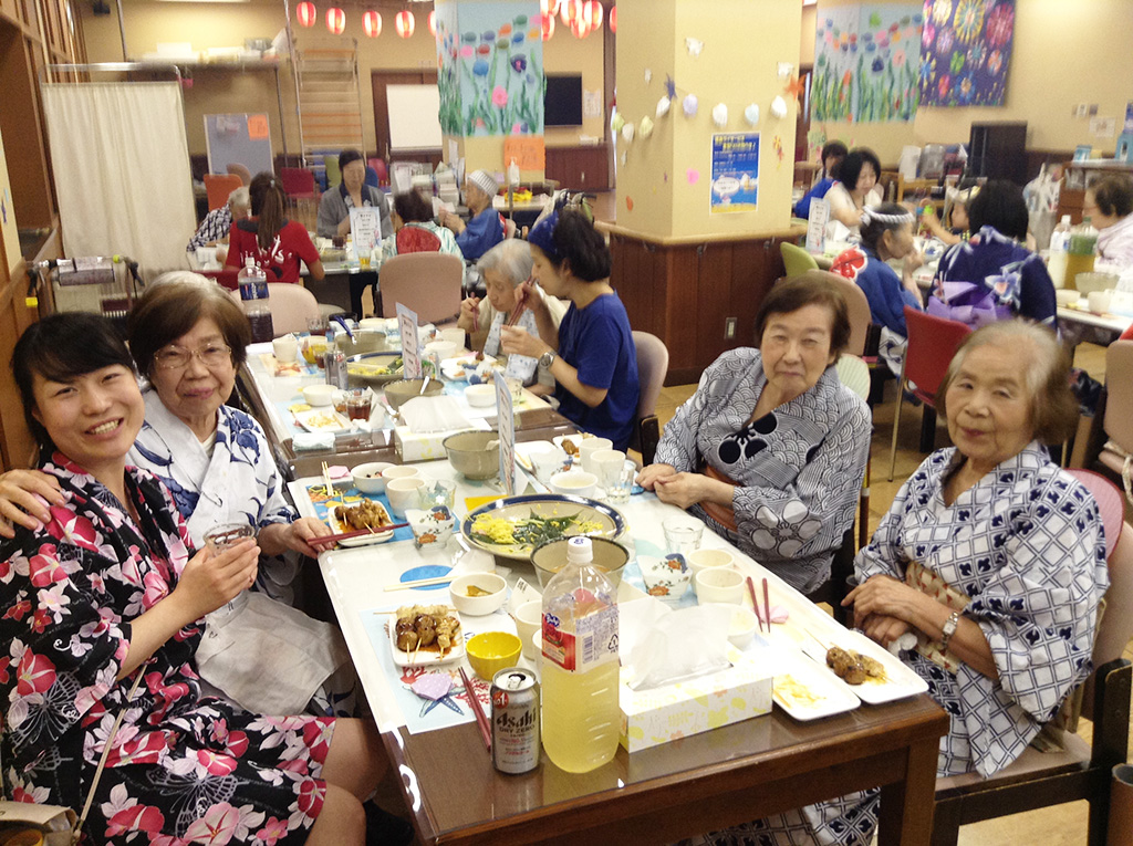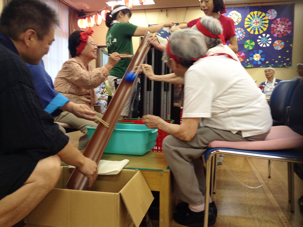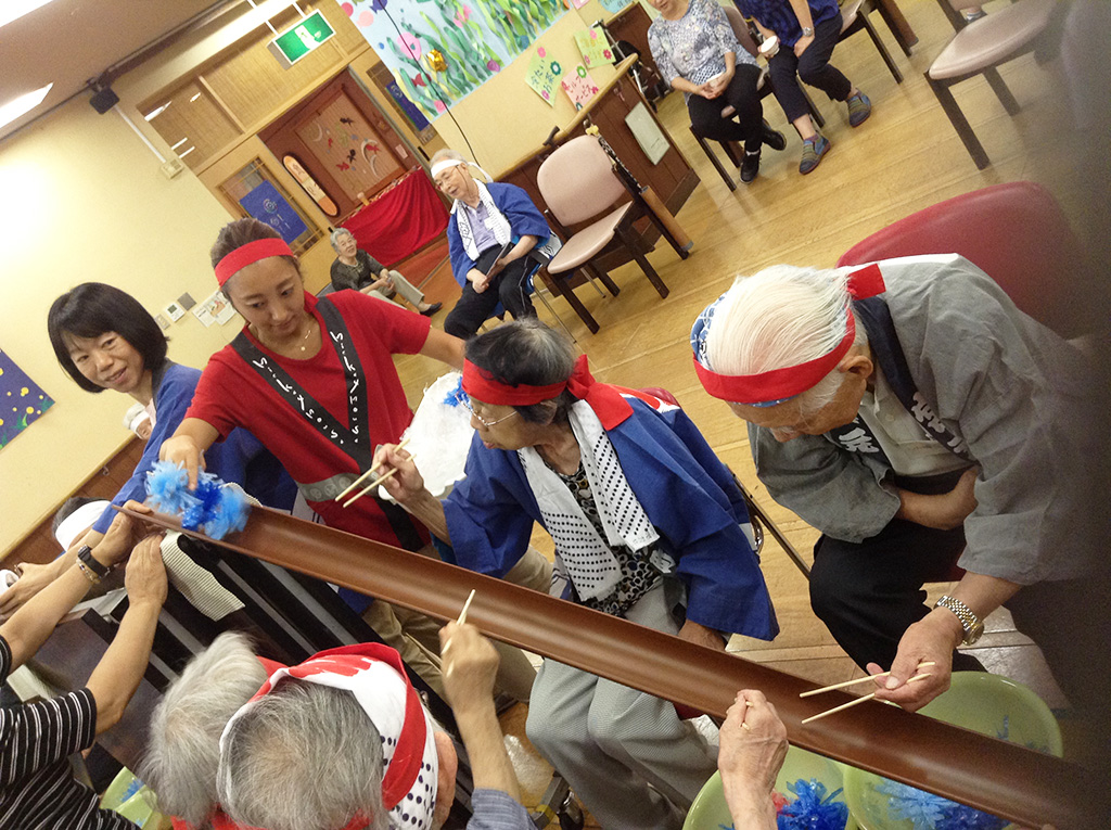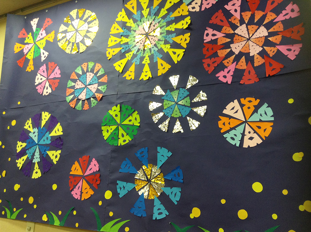 ご利用者様に切ってもらった折り紙の切り絵で大きな花火も打ち上げました♪