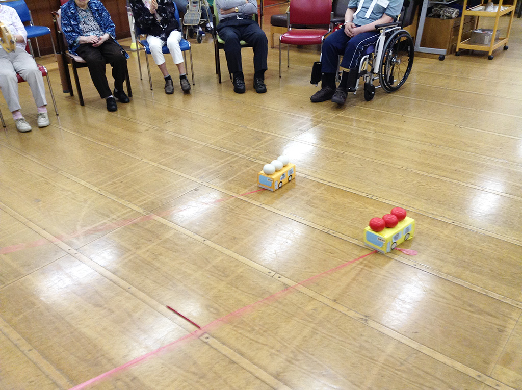 棒についたひもを巻き付けてバスを引き寄せるゲームでした!