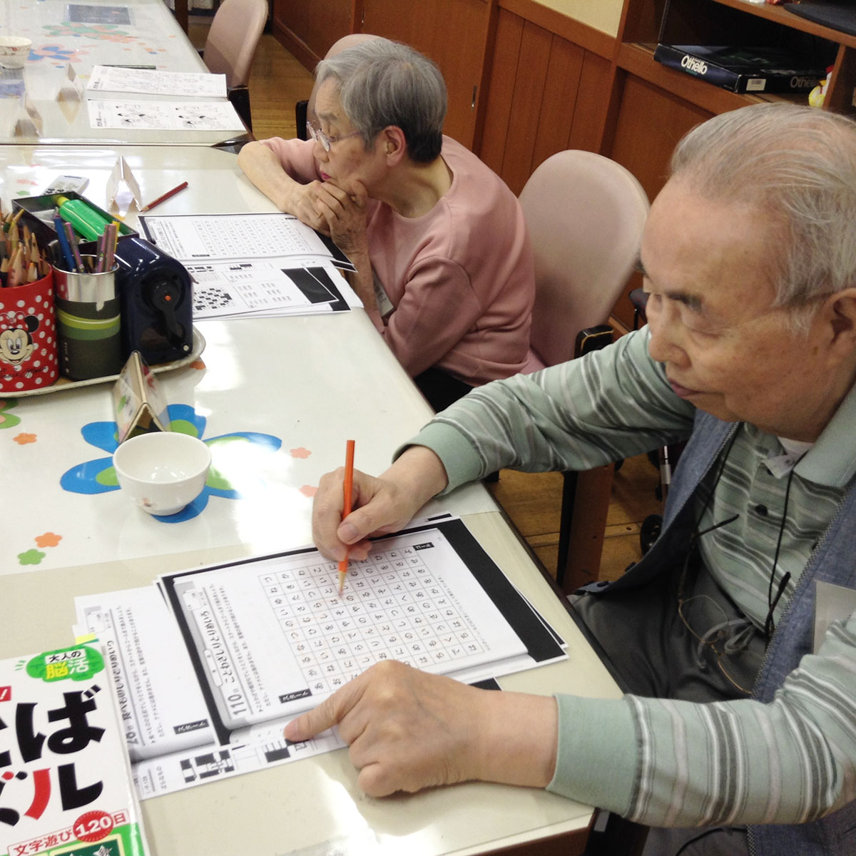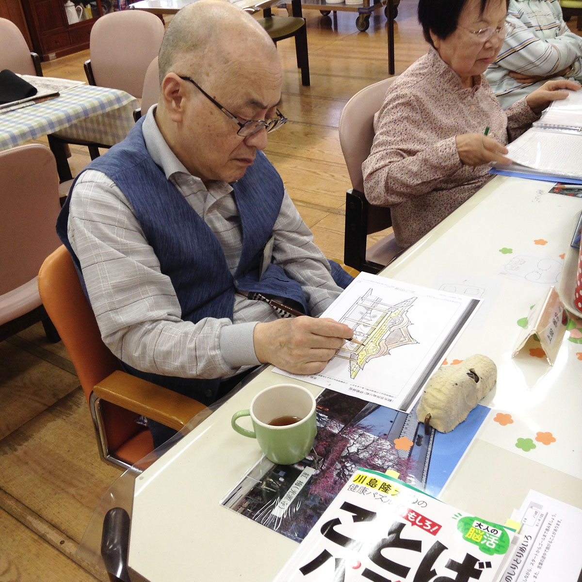 湯島塾の活動のようす 午後の選択活動では、レクリエーションゲームや脳トレプリント(漢字や計算問題等)、大人の塗り絵や書道などお好きな活動を選んでご参加頂いています(*^_^*) 細かな大人の塗り絵は指先を使うだけでなく頭も使えて脳の活性化にも☆ 脳トレプリントに集中!「うーん、難しいなァ!」