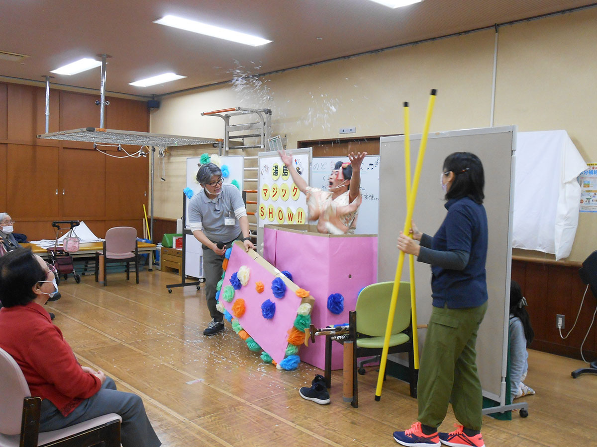 マジックショーは箱に女性職員が入って、外から杖やら棒やら刀やらで刺されていき…