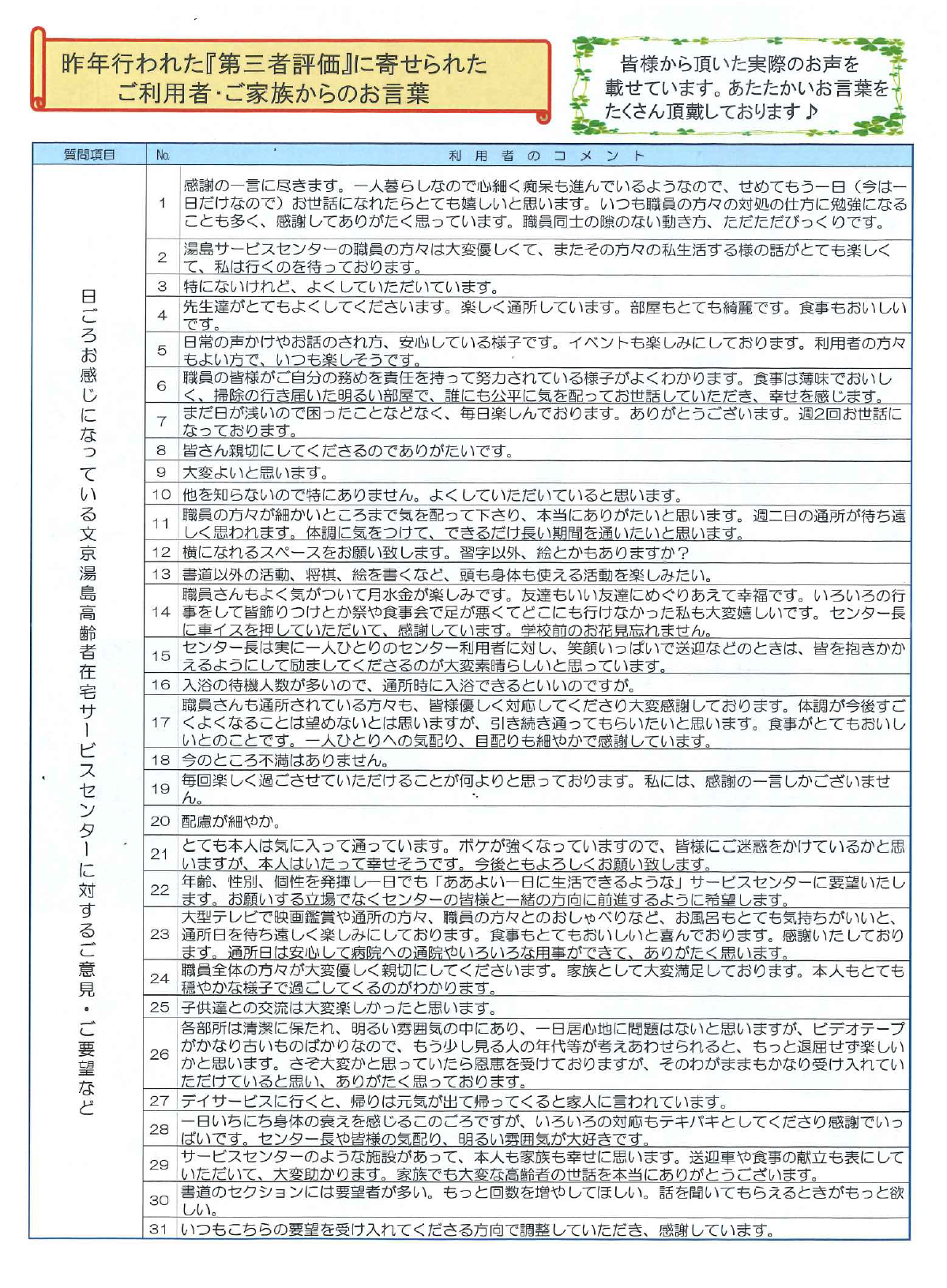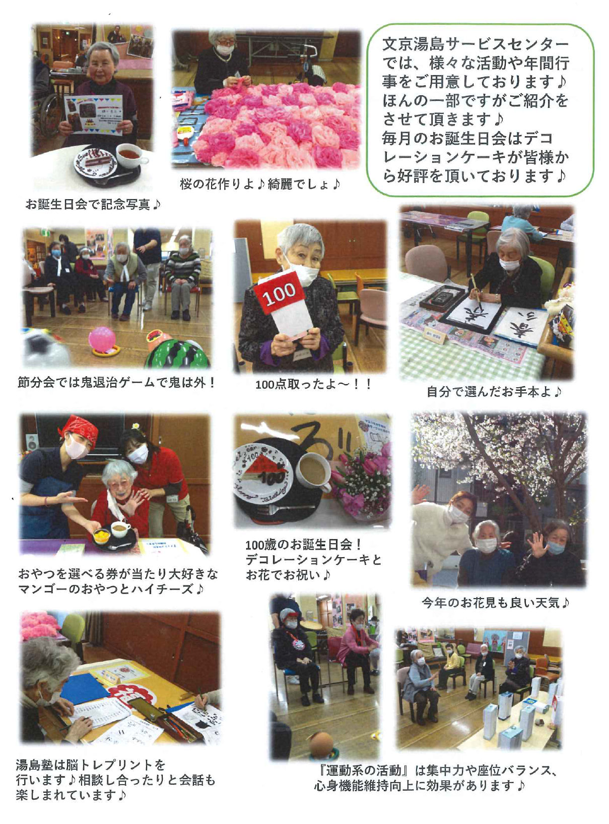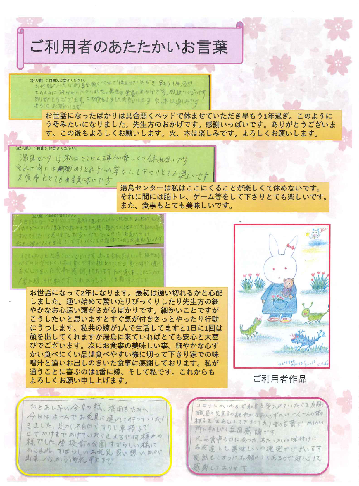 新型コロナで大変な時期は続いておりますが、ご利用者様やご家族様から湯島センターに温かいお言葉をたくさん頂いております!