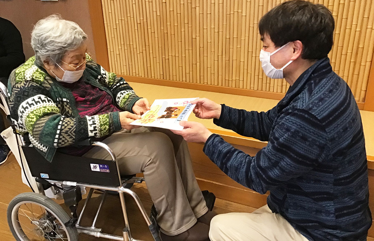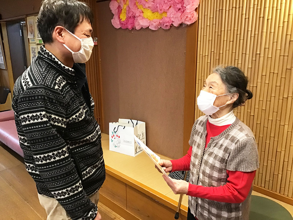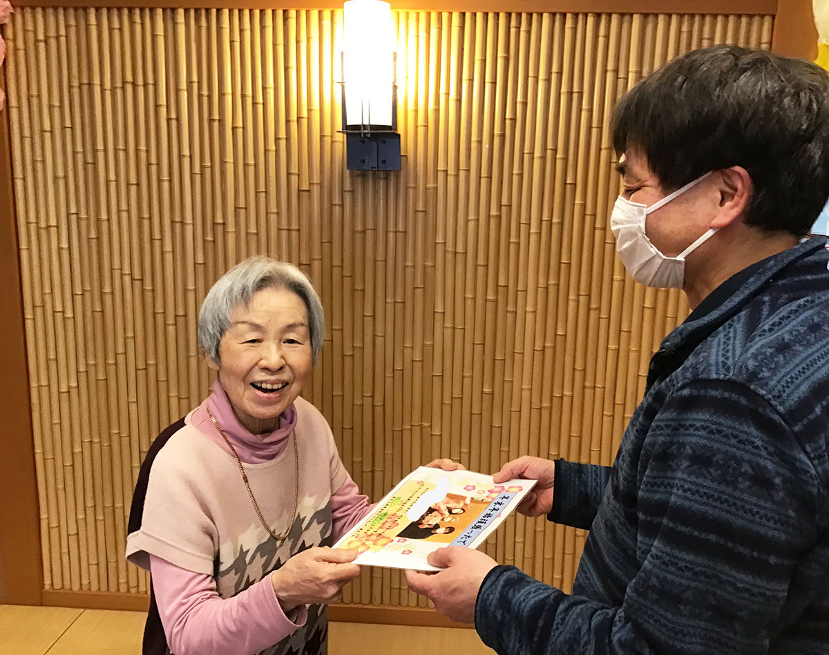 プリントを持ってきてくださった皆様に、賞状と昭和サービスセンターのご利用者が作成したとても素敵な巾着を、今月プレゼントさせていただきました♪