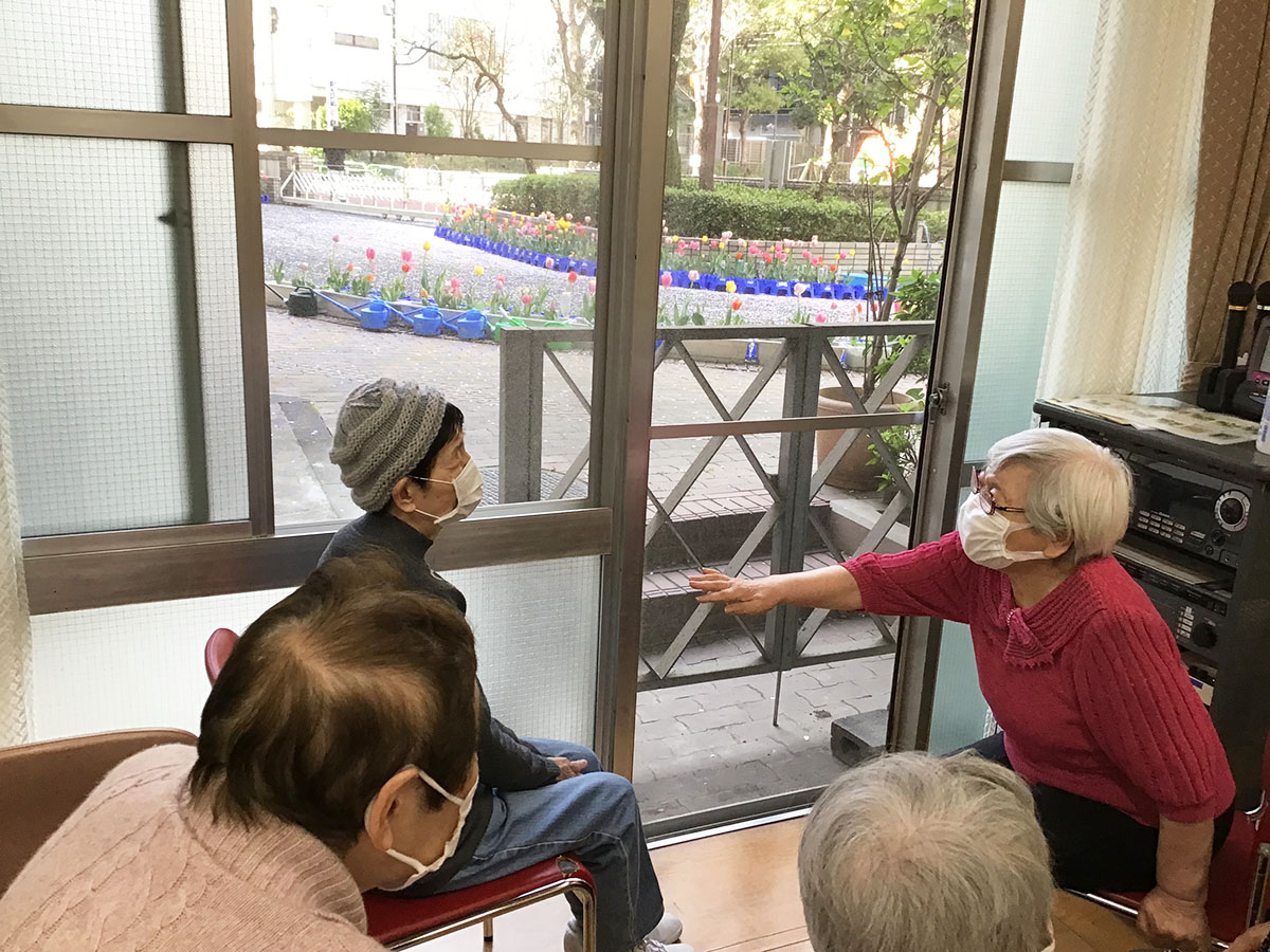 センターの窓から湯島小学校の桜とチューリップを眺めながらお話が盛り上がります🌷