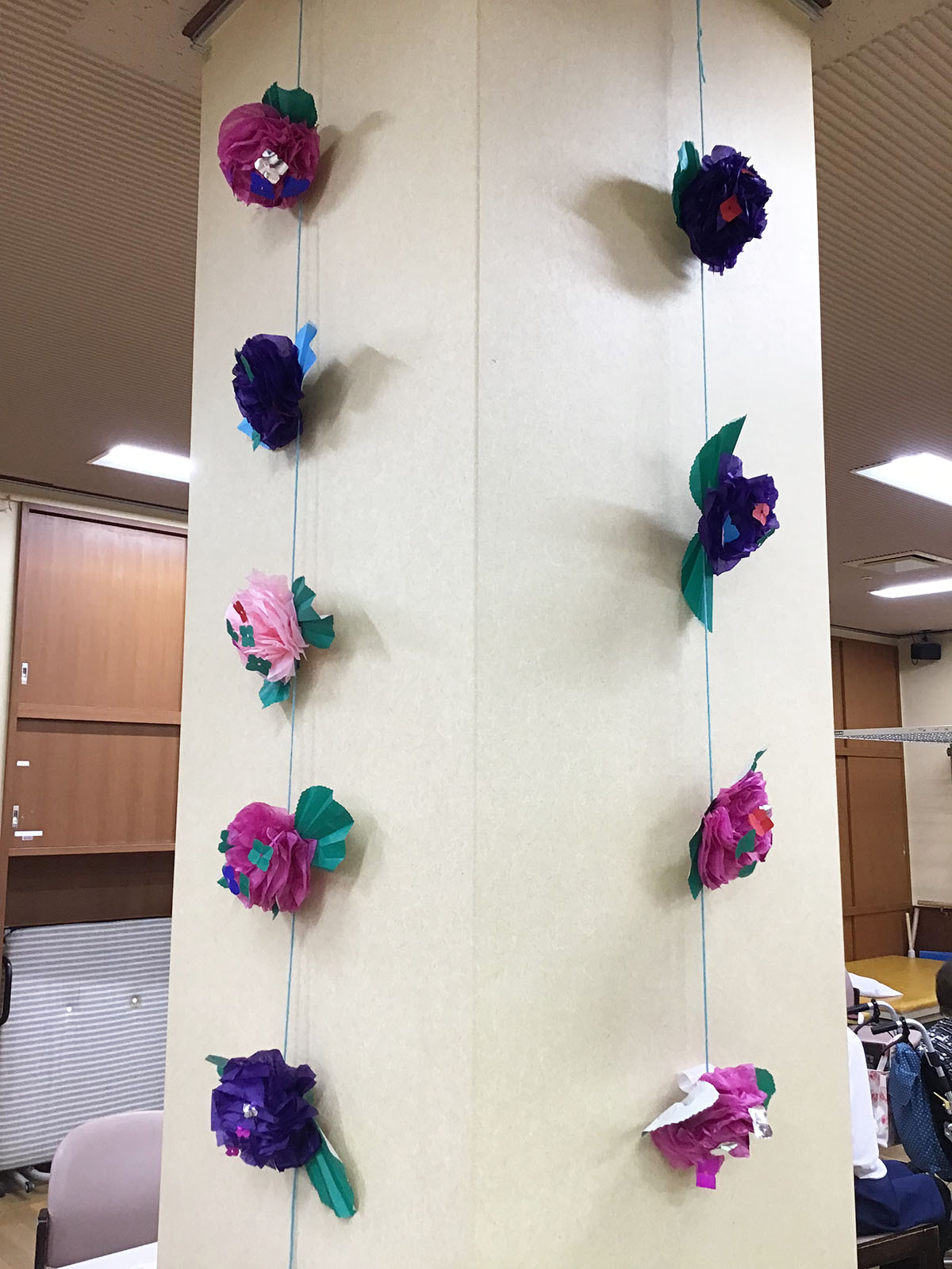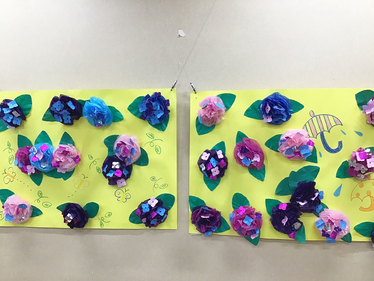 6月の飾りは『紫陽花』です♪ご利用者のみなさまがお花紙で作ったきれいな紫陽花がフロア内を華やかにしてくれています♪
