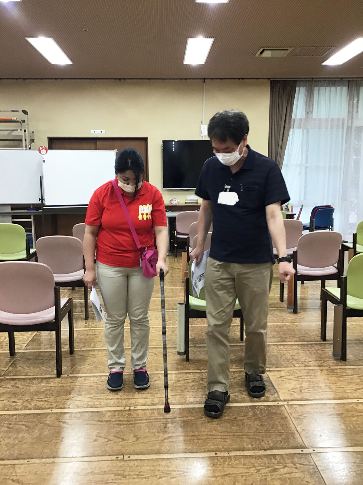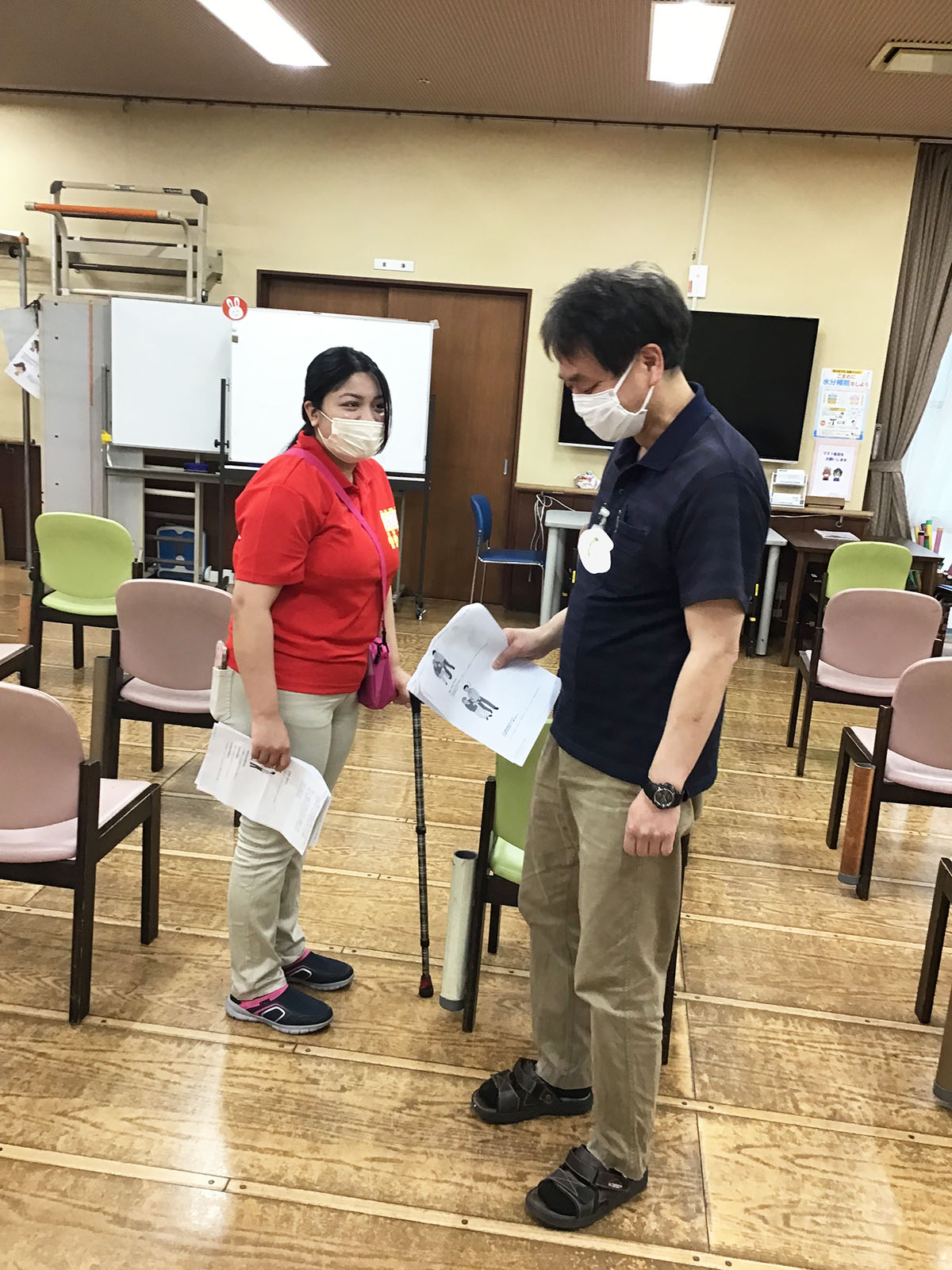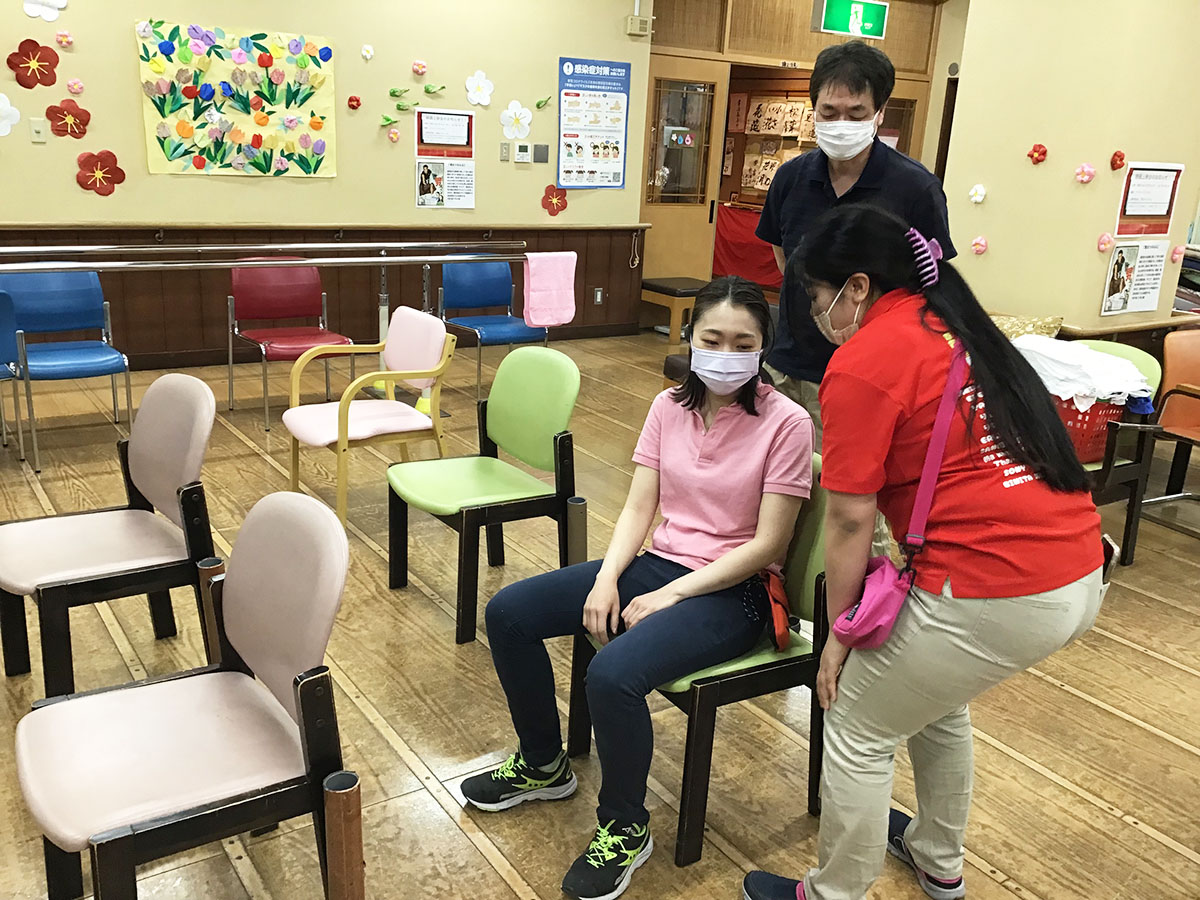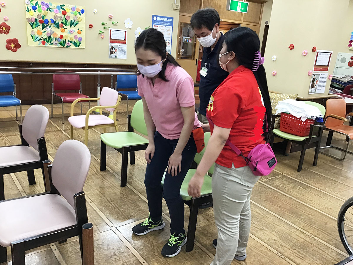 先輩スタッフがご利用者役になり、ご利用者の目線になって、立位の声掛けです(*^-^*)