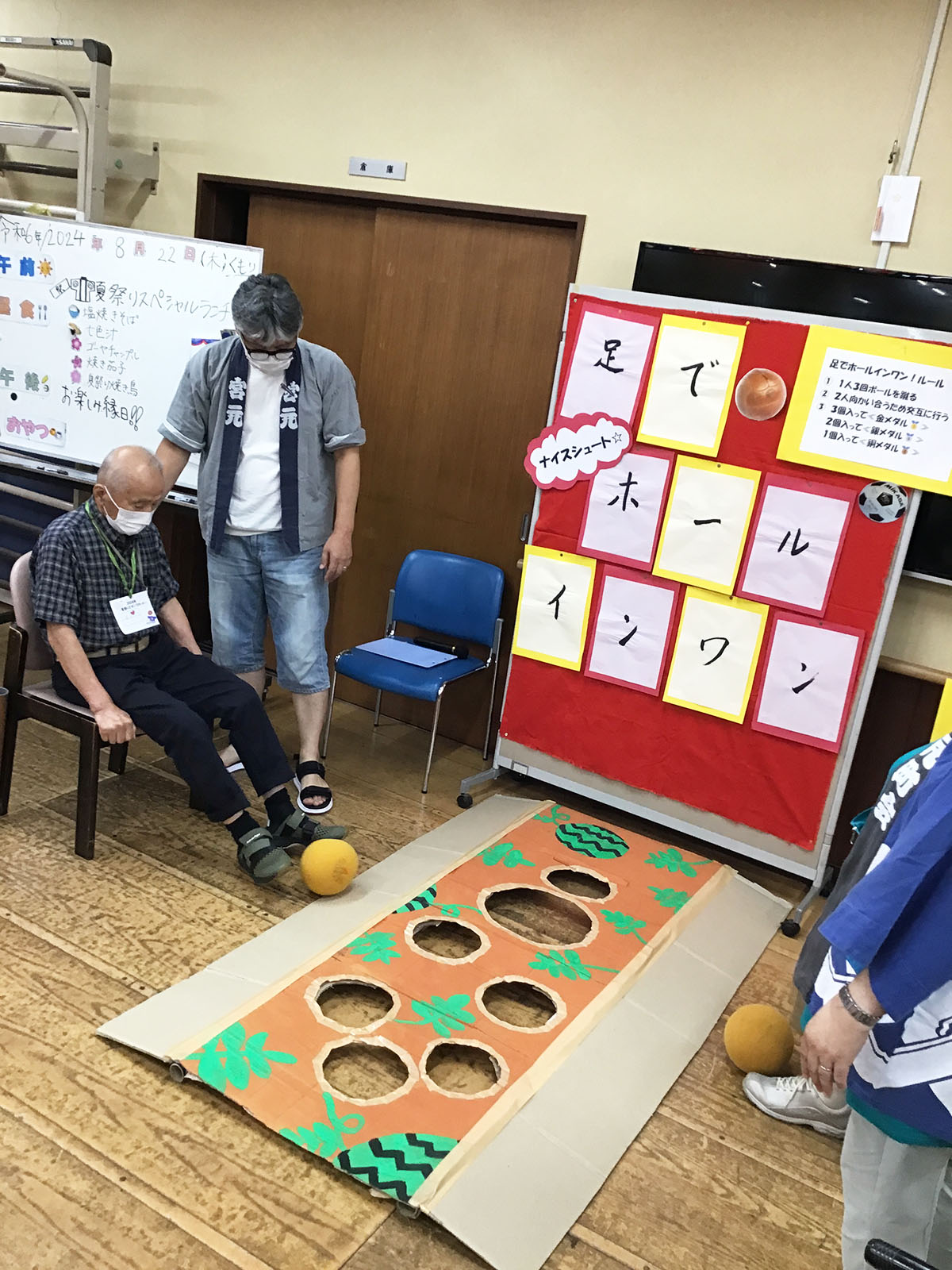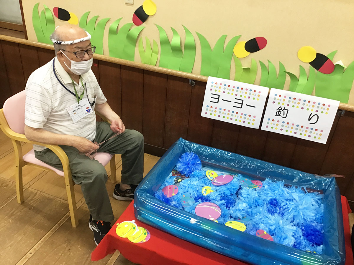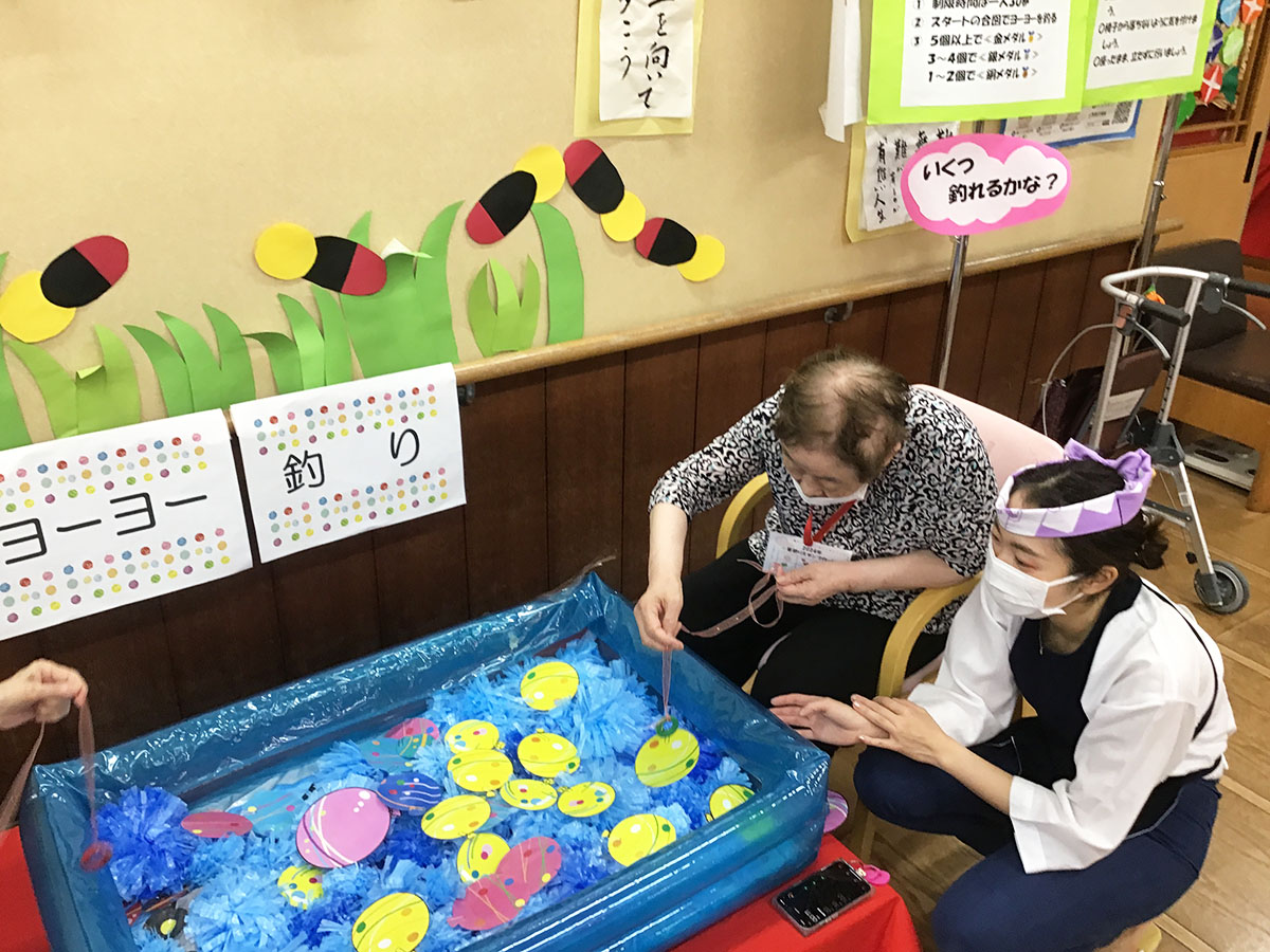 今年は『くじ引き』『ヨーヨー釣り』『足でホールインワン』『射的』『輪投げ』『盆踊りリハビリ』をご用意いたしました♪どの縁日もとても盛り上がっていました~♪