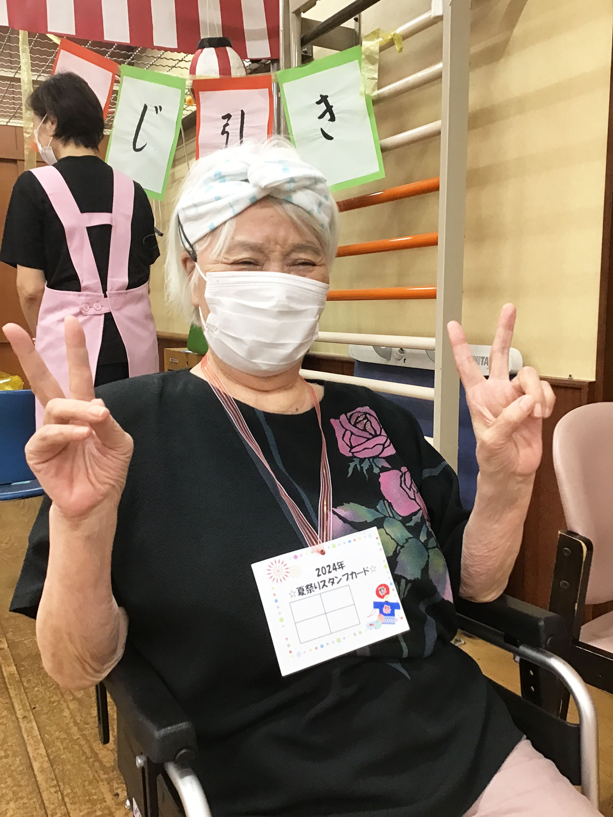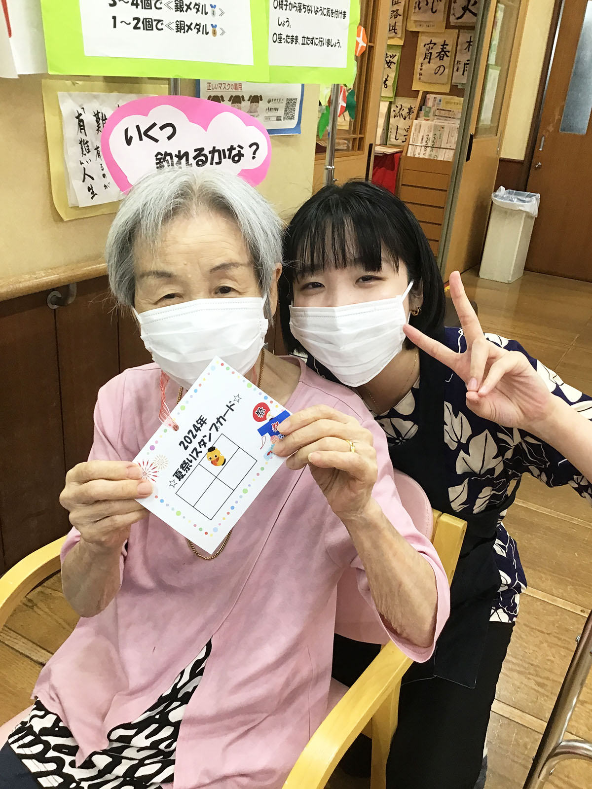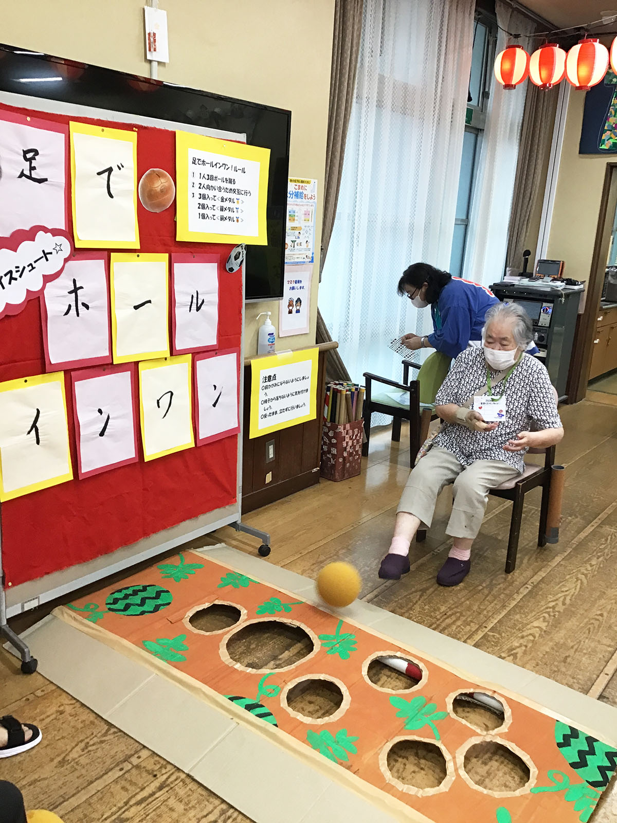 今年は『くじ引き』『ヨーヨー釣り』『足でホールインワン』『射的』『輪投げ』『盆踊りリハビリ』をご用意いたしました♪どの縁日もとても盛り上がっていました~♪